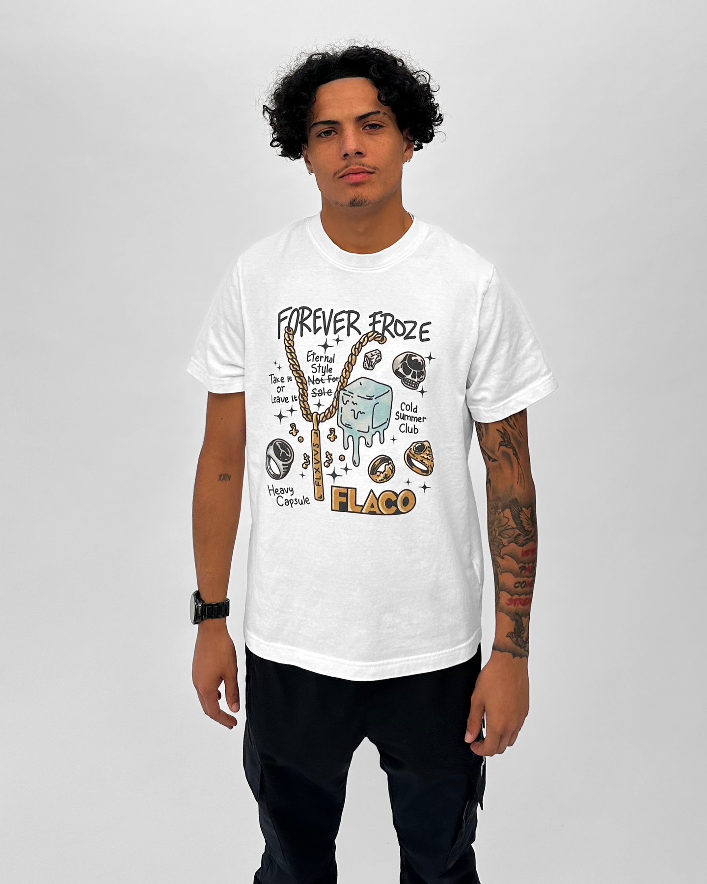 White oversized cut, true-to-size fit. Premium 100% organic cotton tee featuring our “Forever Froze” graphic — a collage of ice-cold motifs including jewelry, rings, skull, chain, and our signature cube.