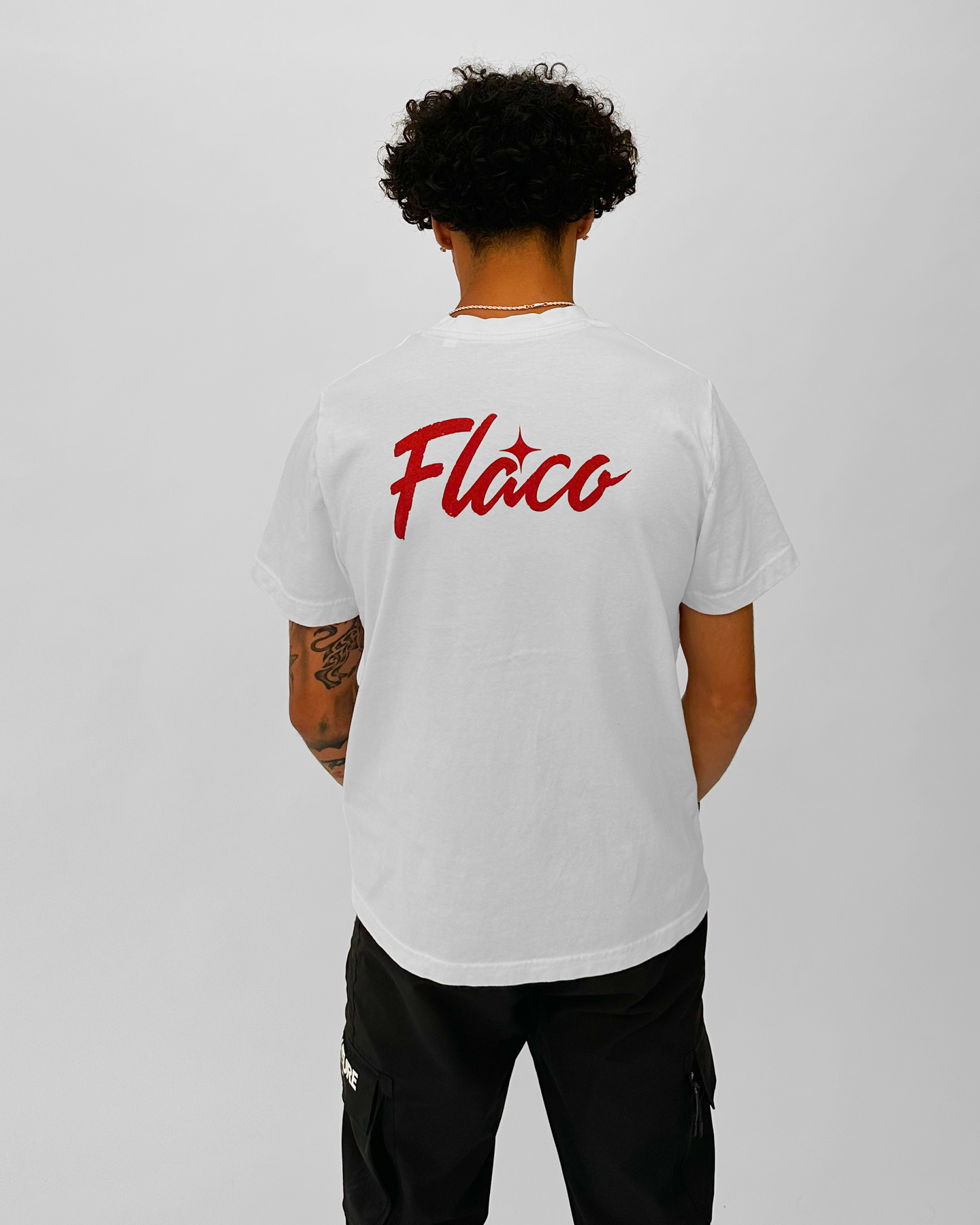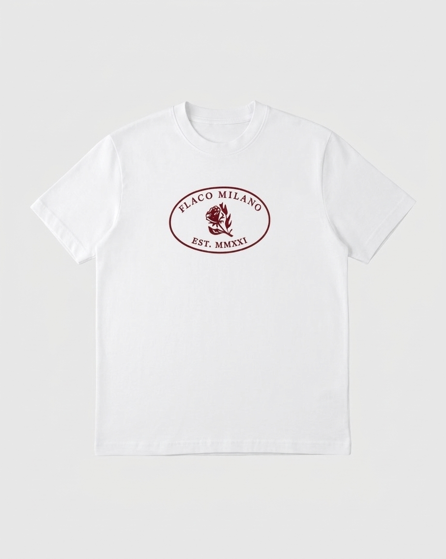 Oversized cut, true-to-size fit. Premium 100% organic cotton tee with our deep red Flaco Milano crest on the chest and script logo on the back.